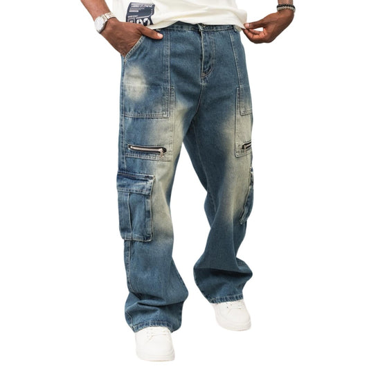 Men's Stone Fade Tactical Cargo Denim Jeans