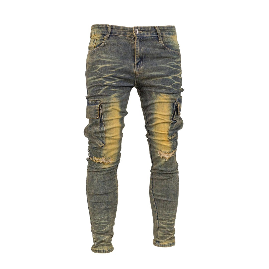 These men's desert washed cargo jeans are a must-have for any fashion-forward man. Made with durable fabric and designed with convenient cargo pockets, these jeans offer both style and practicality. Perfect for any outdoor adventure or casual outing. Upgrade your wardrobe with these versatile jeans.